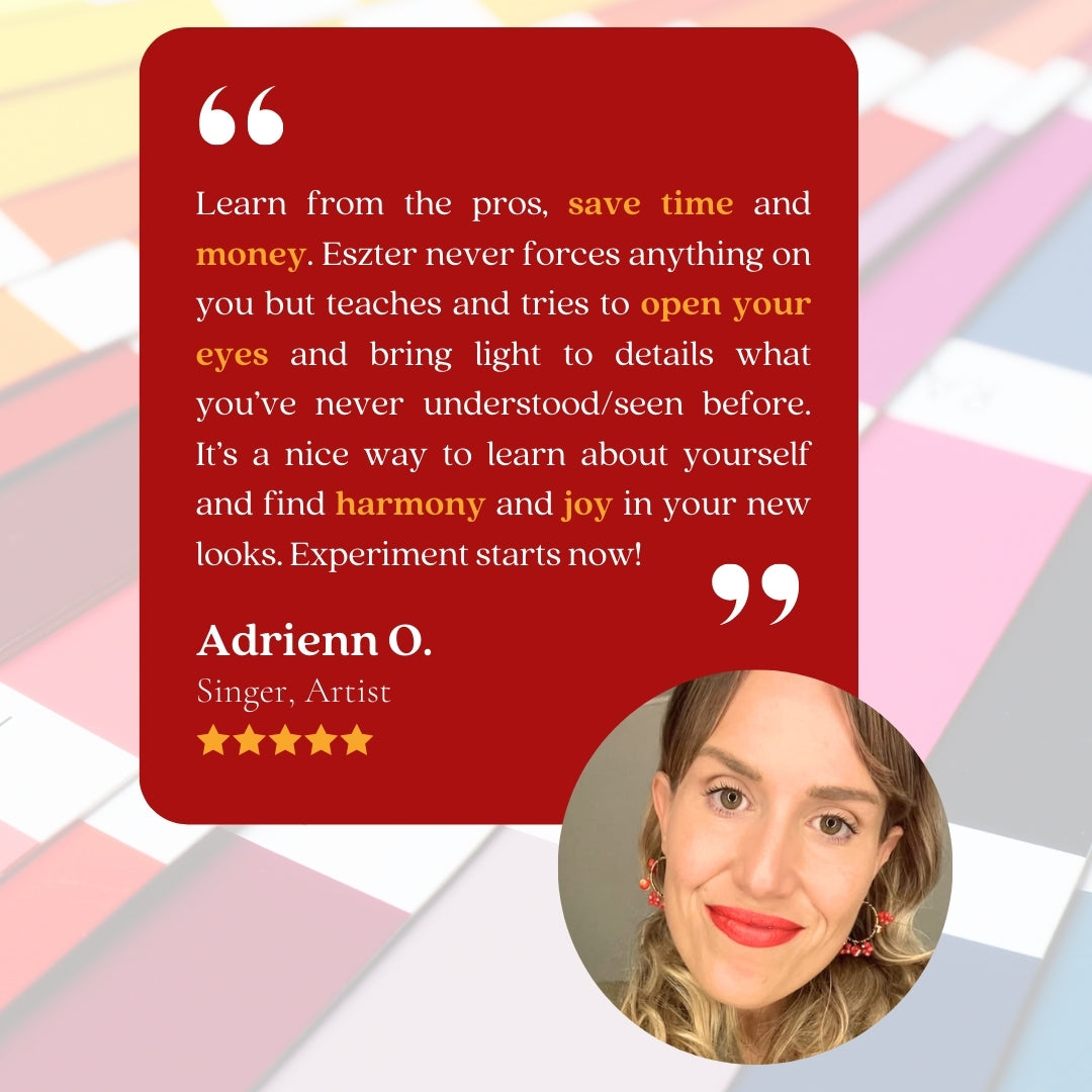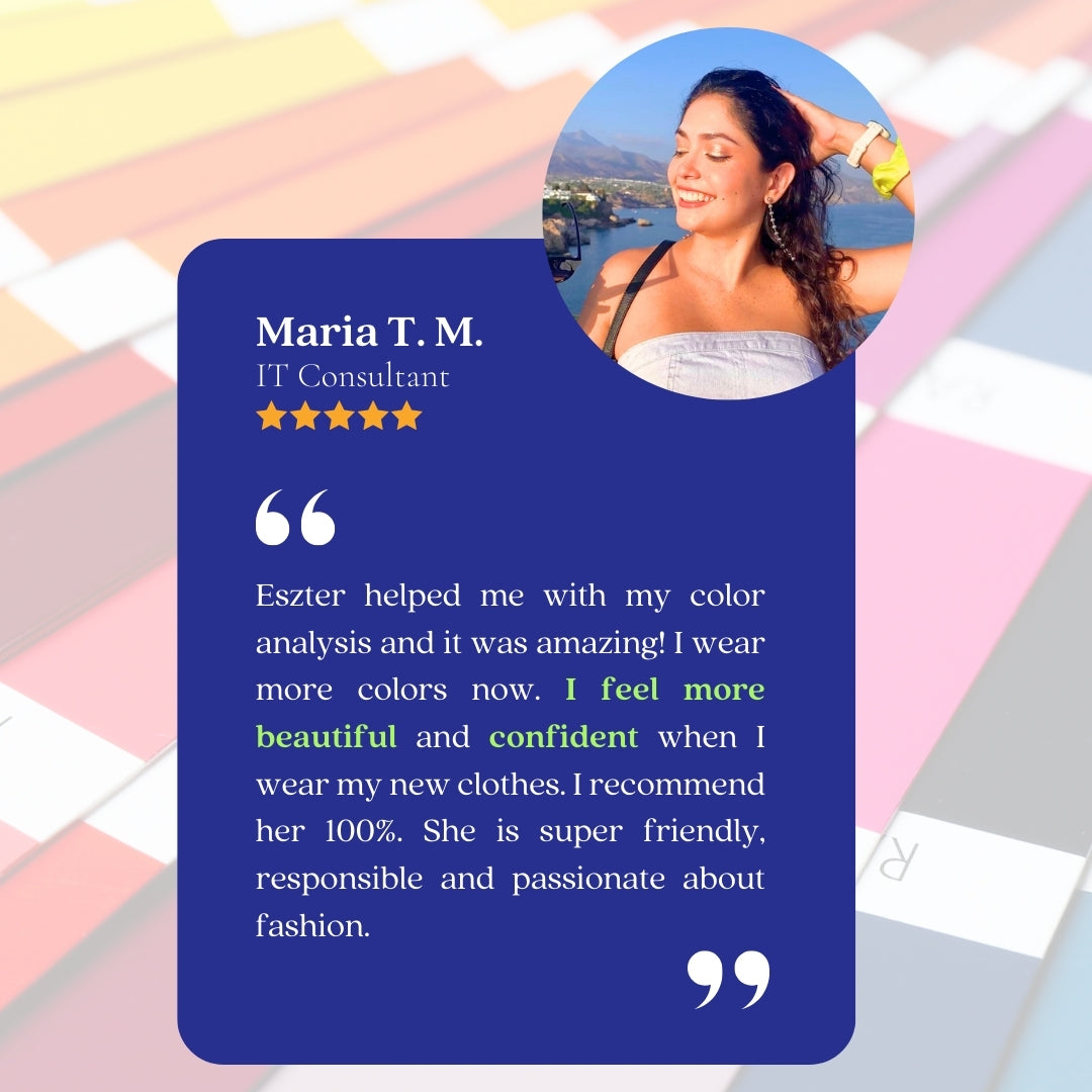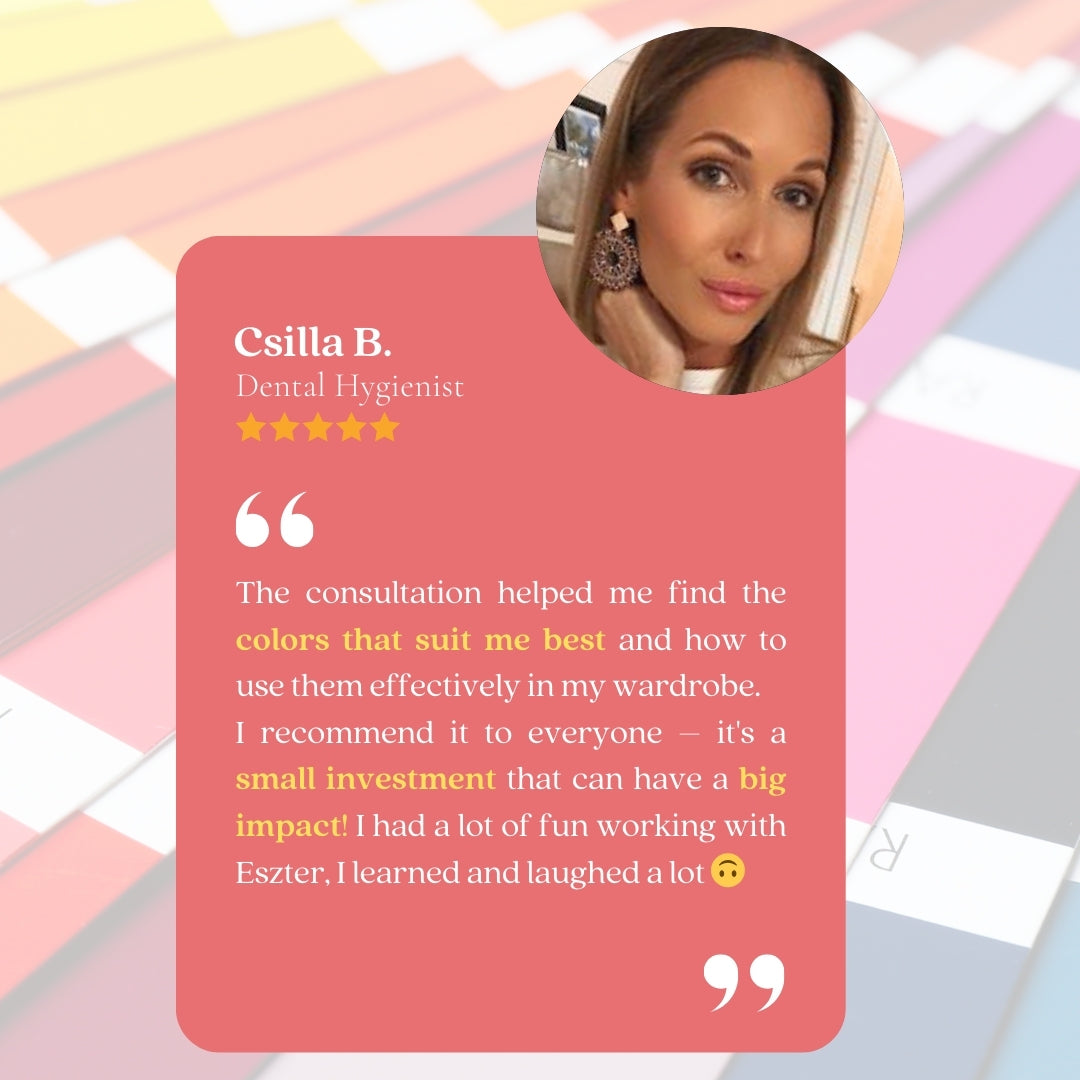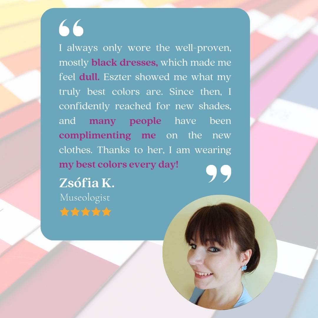 I’m Eszter, and my mission is to help women shine with confidence—by discovering their most flattering colors, refining their personal style, and creating fashion that feels as unique as they are.